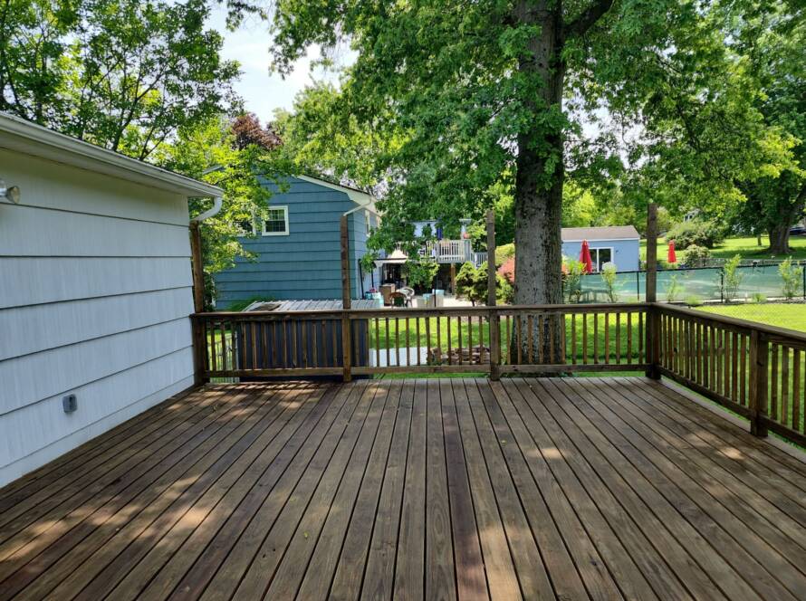 We protected landscaping and hardscape, scraped/spot-sand prepped areas, caulked seams, and primed bare wood before applying durable exterior finish coats to siding, trim, and accents.